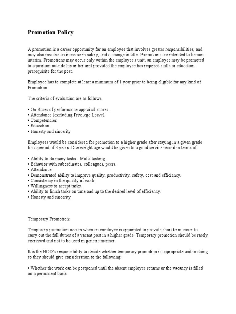 Know more about the criteria. Find out how to effectively hire and promote the right employees, both from within and externally. Download our customizable promotion policy sample template. 147.5 kb (4 pages) ( 5.0, 1 vote ) download or preview 4 pages of pdf version of employee promotion policy (doc: