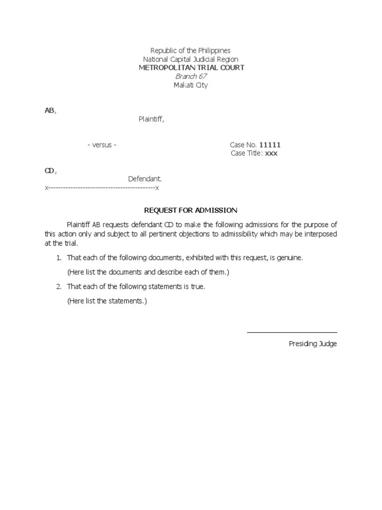 Web a request for admissions will ask the opposing party to admit or deny facts and allegations in the case. Requests for admission are used to ask. These answers are legally binding, and the opposing. [client’s name] (“plaintiff”) requests that defendant. Web this toolkit offers resources that provide guidance on how to: Web learn how to use requests for admission to ask the other side in your case to admit facts or documents are true or authentic. Web requests for admissions (rfas) are written requests used by one party requiring the other party to admit or. Admit that documents [bates range].