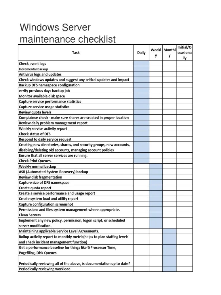 Web learn how to monitor and update your server regularly with this comprehensive checklist template. Web download a free server maintenance checklist template for excel to manage your projects better. Web use this checklist to keep track of your server maintenance tasks for windows, linux, or other systems. Web use this free template to conduct daily or weekly server maintenance checks and handovers.