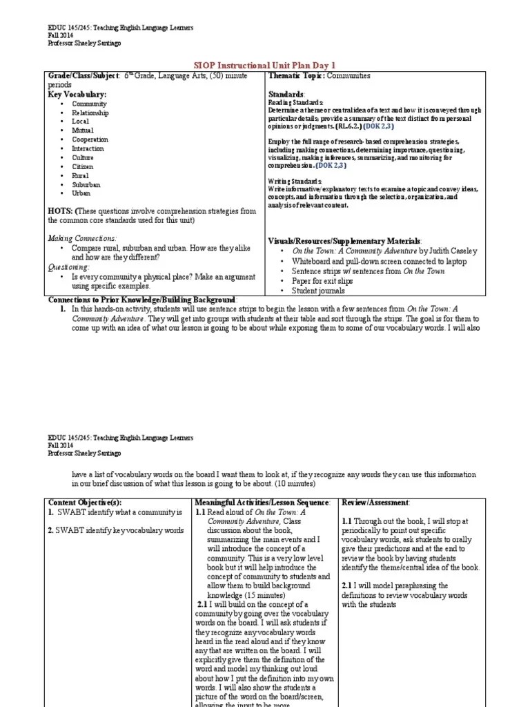 SIOP Unit Plan PDF Reading Comprehension Educational Assessment